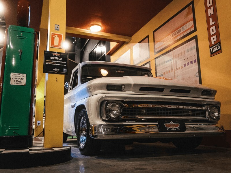 O espaço é amplo e decorado com itens de época, placas antigas e bombas de combustível vintage. A iluminação é pensada para destacar o design robusto das máquinas, criando um clima de "filme de estrada" americano.